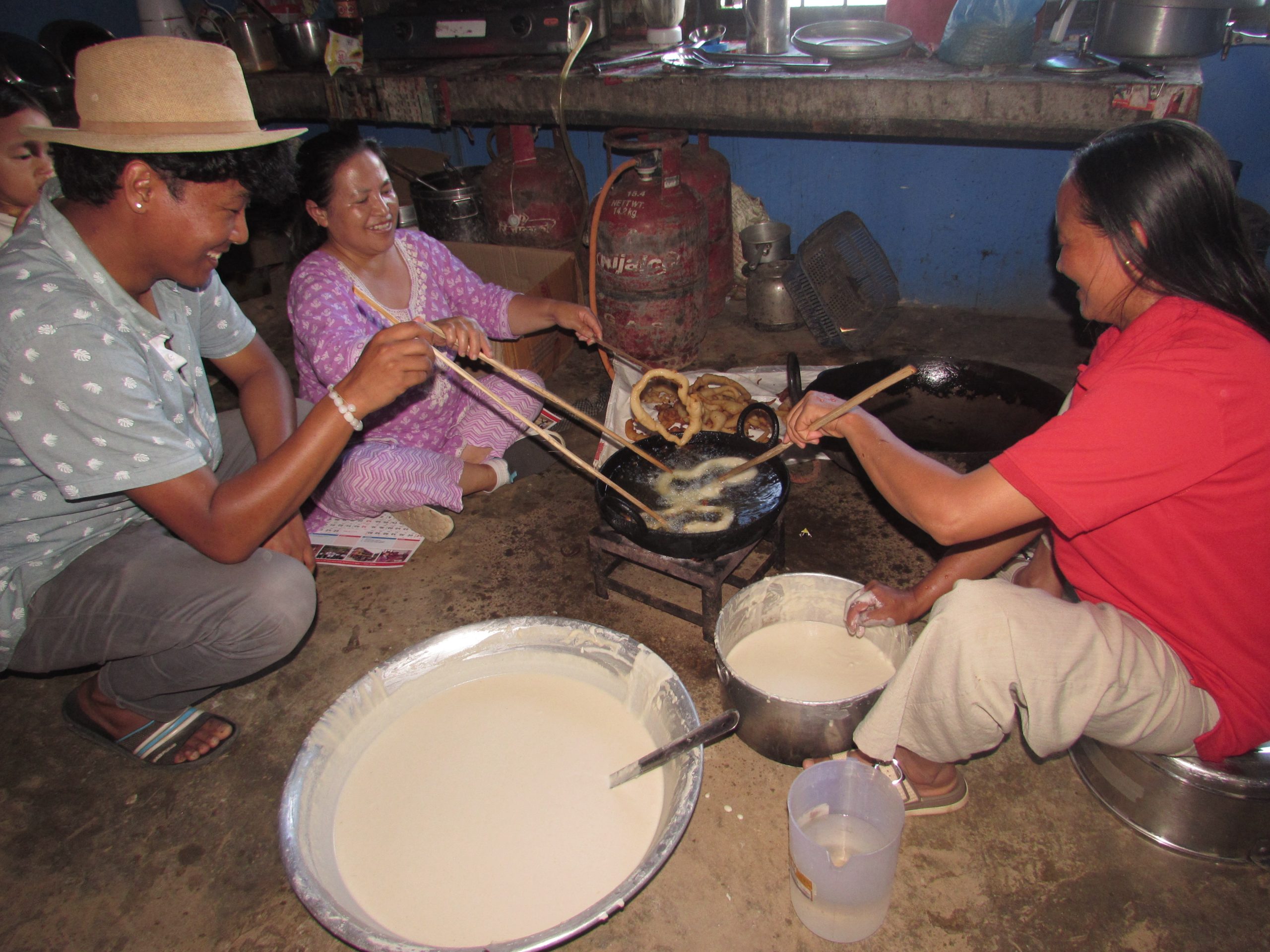 額につける赤い粉のティカと稲の若芽のジャマラで祝福し、先生が手作りした米粉を使って揚げた伝統菓子のセロロティやトマトや唐辛子で作られた調味料のチャトニを味わいながら、詩やダンス、そしてくじ割りゲームのマトカフォドで大いに楽しみました。