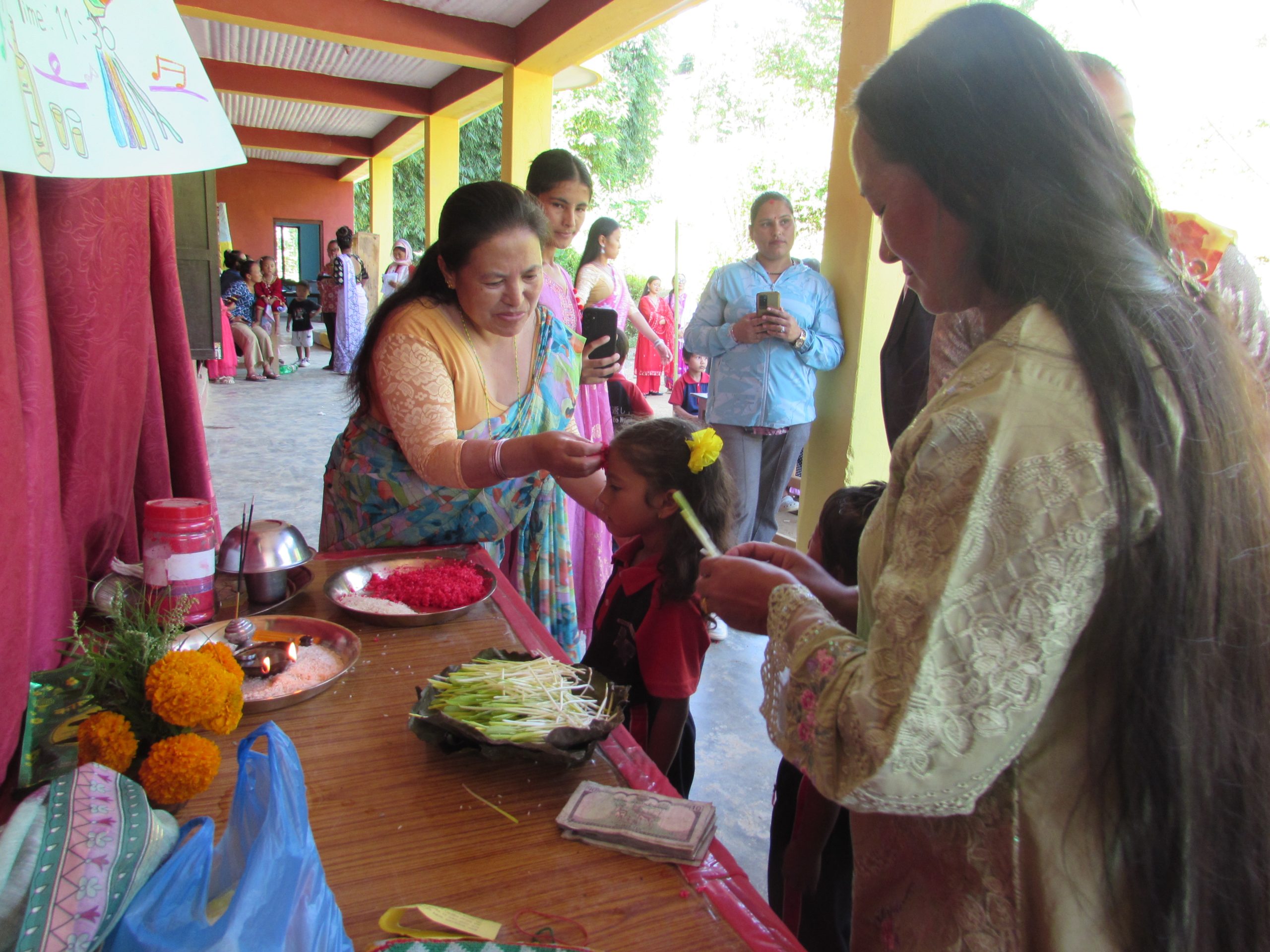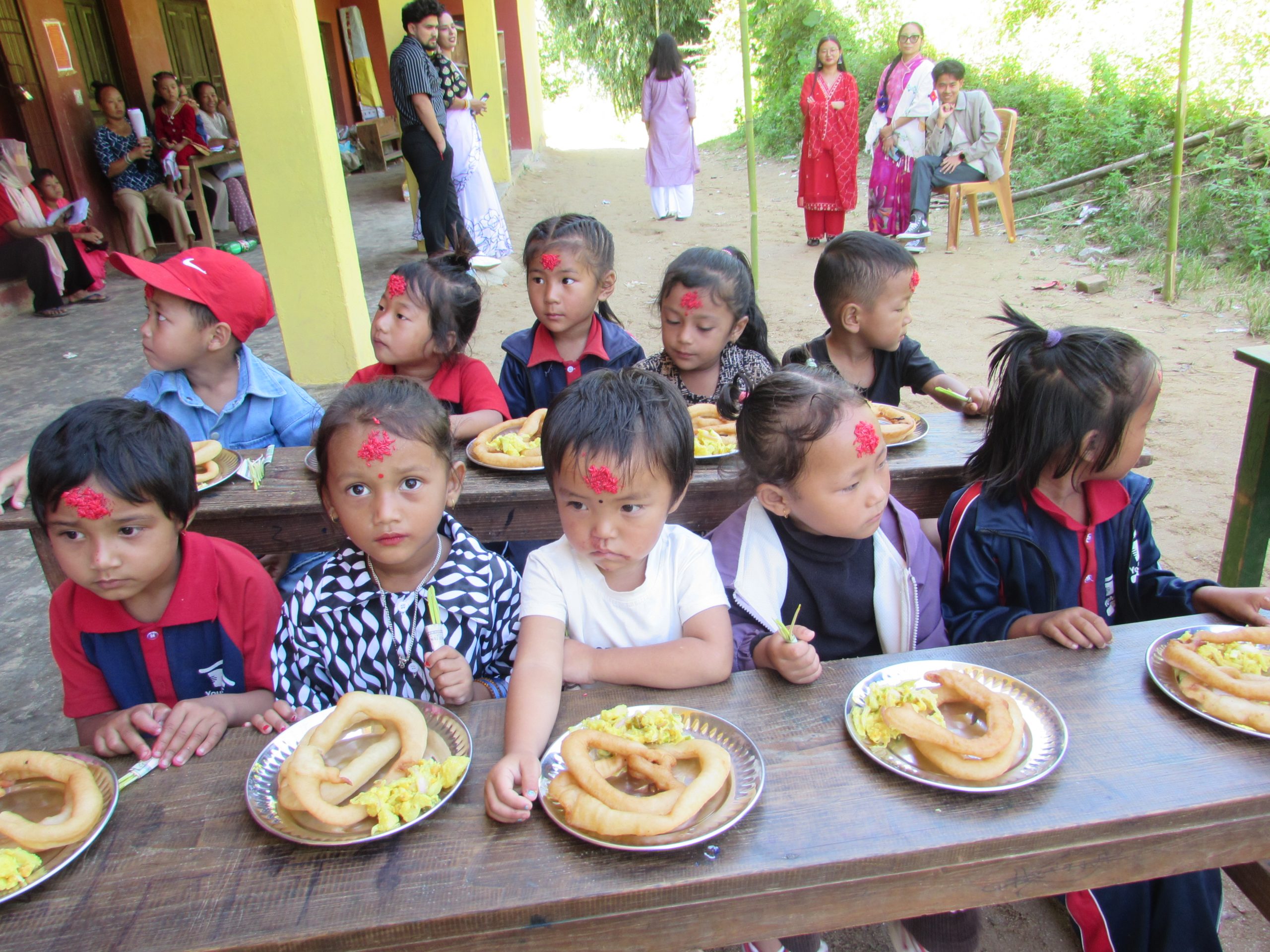 先生やスタッフが子どもたちの額に赤い粉(ティカ)をつけ、稲の若芽(ジャマラ)を授ける儀式を行い、祝福と幸運を分かち合いました。